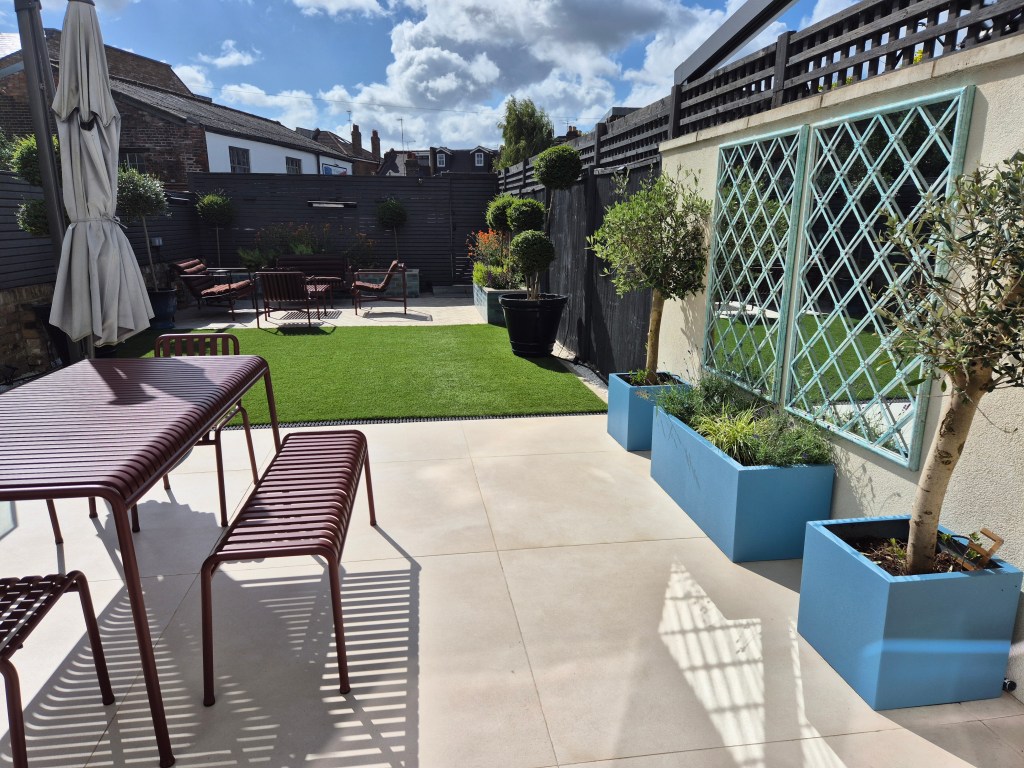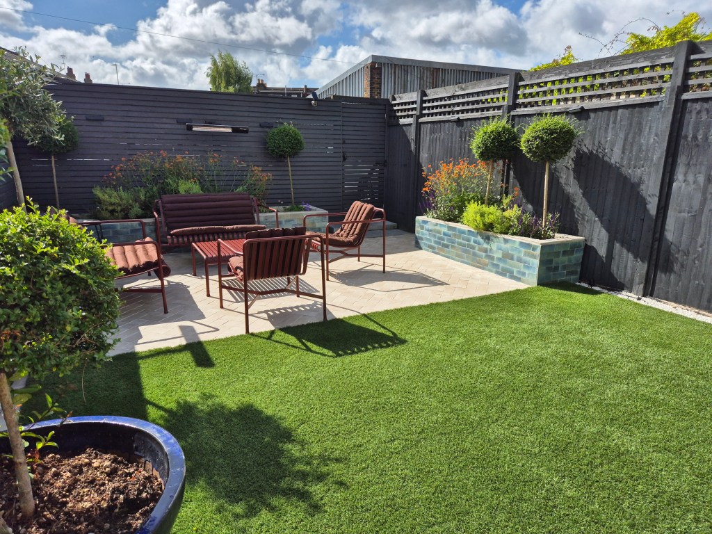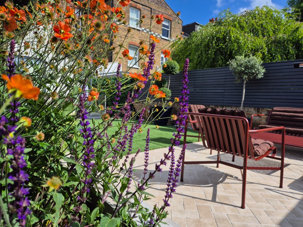 In this contemporary and elegant back garden, 2 sitting areas are provided as well as green space for the family dog to run in. Raised beds provide enveloping greenery and bright uplifting colours and also ensure that the planting is not on the dog’s during its garden explorations. The bright colours of the planters and furniture ensure that the uplifiting character of this garden is carried year around and the mirror opens up the space and creates more room for the eye in the sitting area.