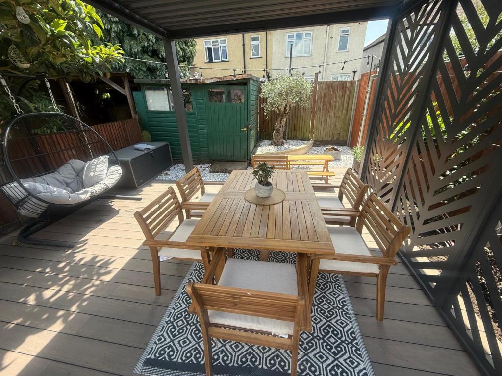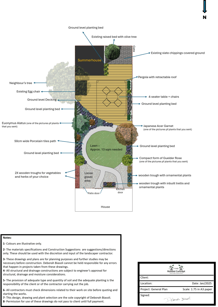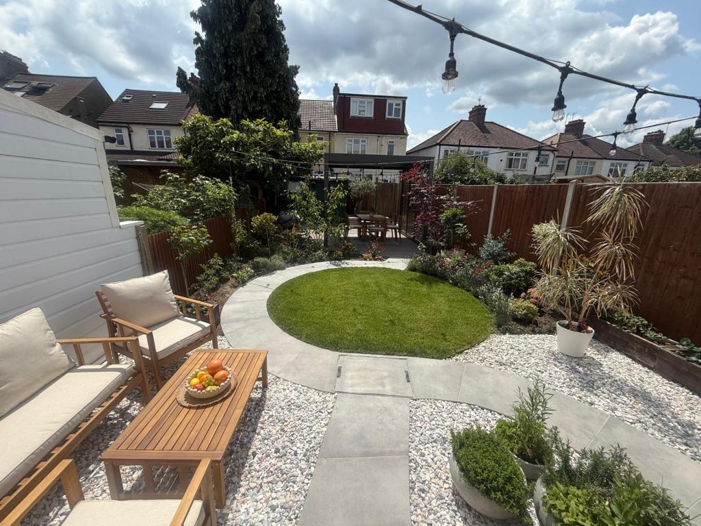 This garden was designed for a young family with a child and features lawn and gravel area with planting for child exploration that can be seen both from the house and from the pergola sitting area for peace of mind. There are 2 sitting areas in this garden and the retractable roof pergola ensures that the BBQ can happen even in the british rain! The circular design was inspired by the quarter-circle shape of the raised bed with Olive tree at the back garden (one of the only existing features) and helps to widen this rectangular garden visually. Overall this is a beautiful, inspiring but also practical space to be in for all ages (and all wheather!).