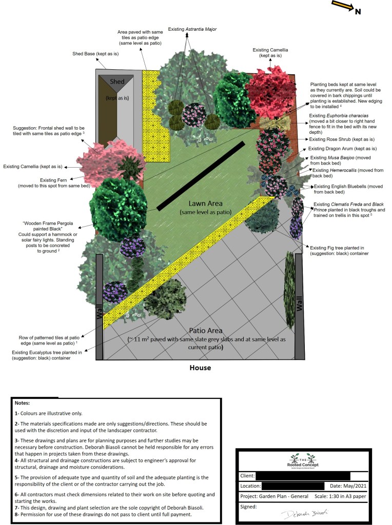 This design was done in order to create a modern tropical heaven in a London back garden. The 45 degrees twisted patio not only makes the most of the sunny side of the garden, but also makes it look wider. Colourful patterned tiles create contrast and focal points in the paving. A diagonal frame pergola in the middle of the lawn space adds height and also creates an opportunity for a hammock and some string lights. The planting is mostly made up of broad leaves evergreen perennials that provide year around interest in order to evoke the tropical style.