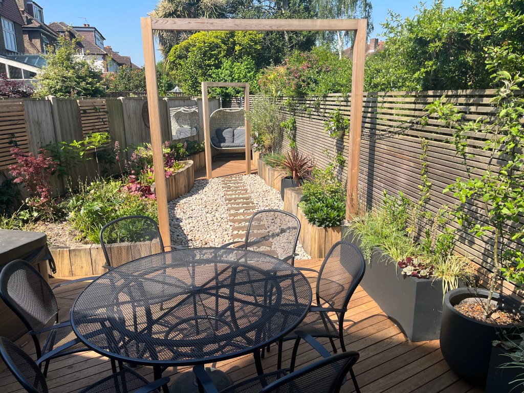This small triangular garden was very carefully laid out in order to disguise the eyes from the “caving in walls” feeling that a triangular shape can bring and to take advantage of every centimeter to be able to accommodate for a hot tub and two seating areas. The materials and planting were also carefully selected to cater for children and dogs and for maximal aesthetic effect and year around interest, with the lowest maintenance possible.